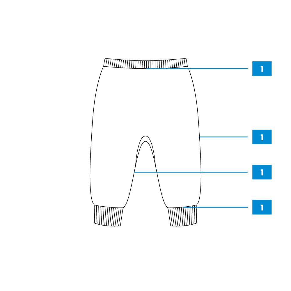 | 2 | Topstitch seams | 406 2-needle cover chain stitch | Sabasoft | 120 | 18 | Sabasoft | 120 | 18 | 70 | 10 | |||||||||||